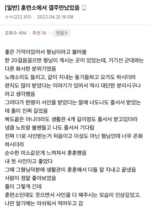 며칠전에 타싸에 올라온 글인데 못 본 사람들도 있을 거 같아서 올려봄... 문제되면 내릴게 ++ 얼마 전 근황이 아니라 20년에 훈련소에 있을 때 일을 얼마전에 올리신 거