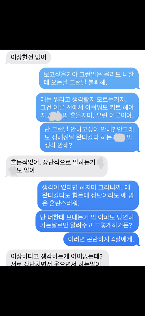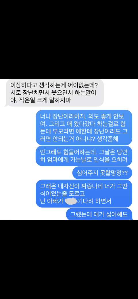 특히 마지막 문자에도 걱정말라며 "자기는"=딸 꼭 가야한가고 늘 말해. 저 부분도 저는 어이없거든요. 만5세 딸이 그렇게 답하니 지가 애한테 그런말 하는건 상관없다는 논리...?