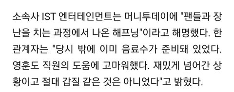 당사자들끼리는 재밌게 넘어간거갖고 제3자들이 더이상 말 엊지 말자... 아이스티 이때까지 불필요한 사소한 것까지도 일일히 해명시키고 사과시켜서 일 키우고 분위기 망치는걸로 유명했는데 이번엔 영훈이도 별 말 없고 공식 입장문보단 기자 인터뷰식으로 입장문 낸거 보면 모르겠냐