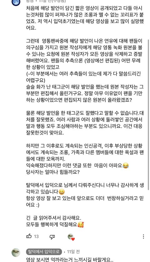 해당영상에 팬이 말한거는 목소리 안나오고 자막만 있었고 팬들이 이거 원본 올려달라고 요청하니까 갑자기 모든 영상 삭제하고 계폭하고 튀었다고함 억까같은데..? 무례한질문 했거나 사생이였나봄 그거 아니고서야 활동언제까지하냐고 묻는팬한테 화날일이 뭐가 있겠어