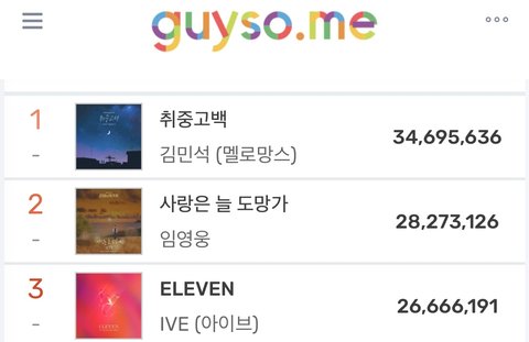 이제 5월이라 저 순위는 무조건 바뀜 그래도 상반기에 이미 나온 곡들 롱런하는거랑 음원강자들 컴백하는거 잘 버티면 연간 탑텐도 노릴 수 있을 듯