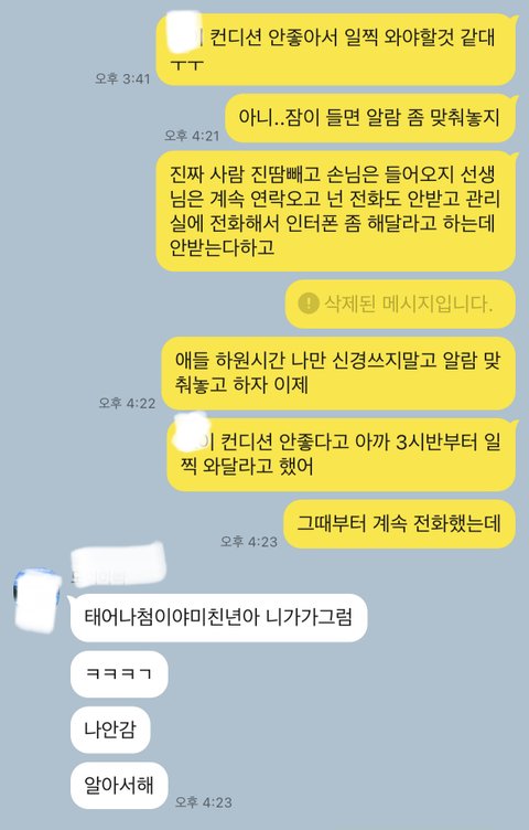 저는 가게를 해서 일하는 상태였고 신랑은 쉬는날이라 아이 픽업가기로 했습니다 그런데 선생님이 아이 컨디션이 안좋아 4시 하원인데 30분 일찍 하원하길 원하셔서 연락이 안되서 관리실에 연락드려 인터폰으로 하고 핸드폰으로 20통 남긴 끝에 연락이 되서 받으니 잠이 들었다고 하더라구요 순간 화가나서 카톡으로 뭐라했는데 바로 험한말이 나오더라구요 객관적으로 누가 잘못한건가요? 제가 알람맞춰놓으라고 잔소리한게 그렇게 잘못된일인가요?카톡도 남겨요 봐주세요