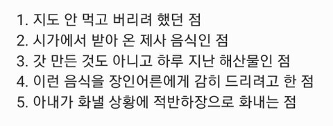 남편:(버럭)우리엄마가 못먹는거줬냐!!!!!!왜 짬이라그래???!!!!!내가 장인어른한테 쓰레기줬냐!!!!