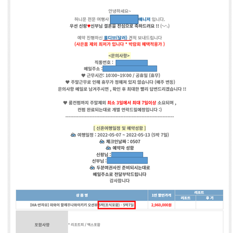담당 매니저와 상담시 진행한 계약서 전달요청하였더니 , 예약 진행 메일로 확인을 하라고 하며 서둘러 마무리 지으려고 하더군요. 뭐 메일로 정확하게 해서 준다고 하니 괜찮겠지 하는마음 이였고 알았다고 하였고 메일을 받았습니다.