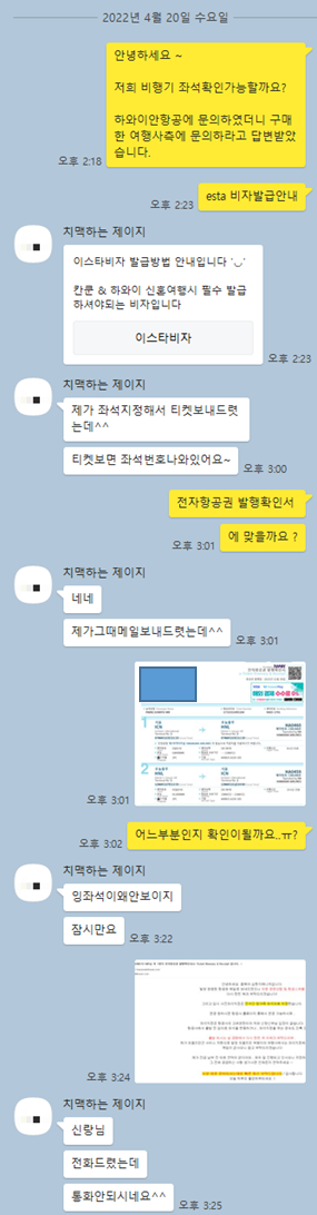 4/20 카톡으로 담당자에게 비행기 좌석에 대해서 문의 하였고, 좌석에 대해 확인 요청을 하자마자