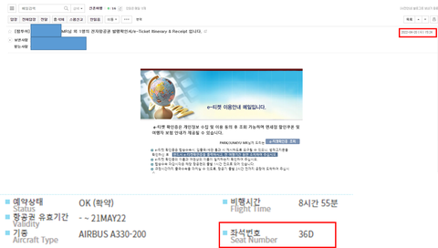 첫번째 전자항공발행확인서를 열어보았을때 , 창가쪽으로 좌석을 지정했습니다 라고 메일에 답변주었고