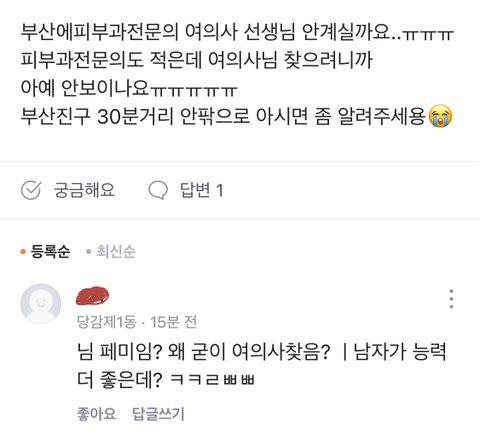 가슴 쪽 피부과진료 봐야하는데 저희 동네엔 여의사 전문의가 찾기 힘들어서 동네생활에 글썼더니