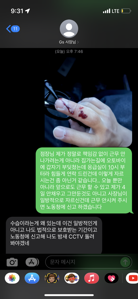 그래서 사장님께 “3시간 남기고 정말 죄송하지만 오늘 오토바이에 부딪혀서 오늘만 알바를 쉬어도 될까요..?” 라고 말씀 드렸더니 “그럼 오늘 일은 누가하냐?” “정말 사고 난거는 맞냐?” 라고 말씀하시고는 일단 알았다 하시기에 죄송하다 하고 전화를 마쳤습니다. 처음 겪는 사고, 놀란 마음에 눈물이 나더라구요..