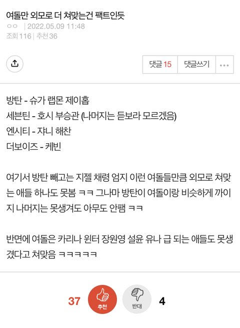 남돌들 와꾸가 훨씬 처참하던데 요즘 여돌들 왜이러노 ㅇㅈㄹ ㅋㅋㅋㅋㅋㅋㅋㅋ 즈그오빠 개같이 빻은건 생각 안하노 ㅋㅋㅋㅋ 여성인권 올려야된다고 지랄할땐 언제고 지들보다 이쁜 여자가 잘나가는 꼴은 죽어도 못보는 판년들 ㅋㅋㅋㅋㅋㅋ