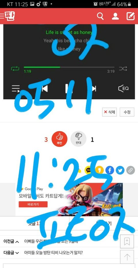 뭐야 왜 지워졌어??? 엥 뭐지??? 글 내가 안지웠고 내가 쓴글 목록가면 내 글 아직 있어 왜 지워지냐??? 저번에 총공글도 그렇고 글 삭제되는 패턴이 좀 이상하다?? 혹시 몰라 인증 남김 +인증 2개 추가