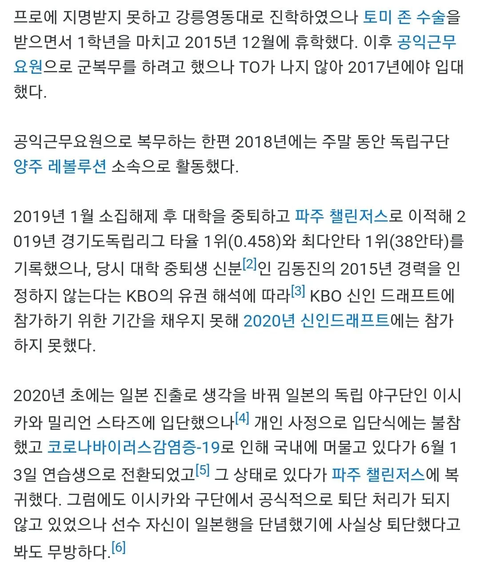 대학 진학 후 팔꿈치 수술하고 휴학-> 공익근무-> 대학 중퇴하고 독립야구단행->