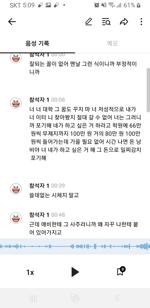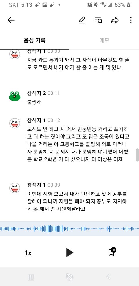 글을 구구절절 한탄하면서 쓸지도 몰라요.안녕하세요. 저번에 엄마때문에 힘들다고 글썼던 학생입니다. 댓글을 읽고 힘이 났어요. 하지만 어제 또 일이 일어났어요. 너무 힘들고 살고싶지 않다는 생각이 들어요..사실 제가 중학교때 엄마때문에 sns에서 같이 목숨을 끊을 사람을 찾아서 시도한적이 있거든요..저번에 썼던건 그때 있었던 일만 써서 제가 왜 그랬는지 아마 제 가정사를 다 말해야 할것같은데 아직 쓸 겨를이 없어서 나중에 써야할것같아요. 일단 아빠집에는 왜 안가냐면 아빠도 다를바가 없는걸 알기 때문이에요. 그리고 제가 여기서 가진게 너무 많고요. 자세한건 나중에 길게 가정사를 다 쓸수있을 때 알려드릴게요.지금도 너무 살기싫다는 생각이 들어요..월요일에 동생이 영어학원이 9시 30분에 끝나는데 집에 11시 30분에 들어왔어요. 엄마는 난리를 쳤어요. 저도 이해하죠 늦게들어왔으니까. 근데 그 불똥이 저한테까지 튀었어요. 영어학원을 다니지말래요. 저는 영어학원을 끊고 메가스터디 강의를 들을 계획이였는데 메가스터디를 안해주니 저 혼자 공부하는 상황이 되었어요. 어제 엄마는 제가 집에 들어오고나서 미친사람마냥 사소한거부터시작해서 행동 하나하나 자기가 맘에 안드는걸 다 따지기시작했어요. 녹음 했었어야했는데 휴대폰을 뺏겨버려서....용돈도 안줘서 돈도 없고 카드를 받아서 그때마다 쓰는데 필요할때 써도 뭐라해서 죄책감을 느끼게끔해요. 제가 돈을 모아놓은줄알아요. 만원밖에 없는데. 카드도 가져가서 필요한걸 살수도없고 학교에서 스승의날때문에 돈을 걷는다는데 돈이없는데 어떻게 내요..... 엄마는 음료하나 사먹는것도 뭐라하고 친구들은 한달에 최소 5만원씩 받는데 엄마는 5만원을 저희가 쓸게 뭐가있냐면서 한 3달은 쓸수있다면서그러고요. 이정도되면 돈이 없는데 너가 철이 안든게 아니냐하실수있어요. 아니요. 저는 엄마가 저에게 집안한탄을 해서 집에 돈이 없는것도 알았고 동생에겐 돈얘기를 안해서 동생은 펑펑써도 뭐라안하고요. 영어학원갈때마다 동생은 매일 빽다방에서 아이스티 사먹는데 아무말도 안해요. 저는 사고싶은게 있어도 얼버무리면서 눈치보면서 카드쓰는데 동생은 제가 돈을 많이쓴줄 알아요. 저번엔 '니년이 제일 많이 썼는데 니나 카드쓰지마' 이러면서 싸웠어요. 알바를 할까했지만 받아주는곳이 별로 없거나 보건증을 끊어야해서.. 처음으로 아빠에게 전화해서 돈을 달라고할까 생각해봤지만 엄마한테 전화하거나 안줄것 같아 두려워서 못하겠어요...이런일이 있을때 눈물이 나올때 저번에 엄마가 죽어버렸으면 좋겠다고 종이에다가 끄적였어요. 종이를 숨겨놨는데 찔려서그런지 자기 욕을 해놨는지 종이를 찾나봐요. 발견했더니 뭐라 적어놨더라고요. 저는 제가 잘못했다고 생각하지않아요. 저는 몇번이고 죽고싶다는 생각을했는데 제가 순간적으로 그때 감정을 적어놓은걸 자기가 찔려서 욕해놓은 종이가 있는지 찾아서 제가 직접 죽으라고말한것도아니고 자기는 그걸보고 화내는게 어이가없어요.지금은 손이 떨려서 어디서부터 말해야할지몰라 사진이랑 녹음 텍스트파일 캡쳐해놓은걸 올릴게요.전 쌍욕도 한적없고 딱 한마디 종이에 적어놨을뿐인데 제가 엄마한테 겪었던 일에 비해 아무것도아니고 엄마는 기분이 나쁠뿐 피해는 안가면서 저를 그냥 죽일년처럼 봐요... 정신차려야할건 엄마에요. 자기가 자식들을 죽이고있으면서 자기 행동이 잘못된건줄 몰라요.학원도 너희한테 투자한게 얼만데 성적이 이따구로나오나면서 투자? 제가 돈을 벌면 안주면 안준다고 욕할 사람이란걸 알았지만 자식을 키우는게아니고 자기 연금나오는 돈기계로 생각하는것같아요.나한텐 그렇게 상처를 줬으면서 그냥 종이에 끄적인걸보고 발끈하면서 죽을죄를 지었단듯이 감히 엄마한테 그러냐며 때리는지..... 주변 사람에게 다 말하고싶고 도망치고싶고 제가 왜 이런곳에서 태어났는지싶고 다른 친구들은 돈많고 보통가정에서 그럭저럭사는데 저는 그런 그럭저럭도 안되네요... 왜 자기 선택으로 아이를낳았으면서 나에게 상처를주는지 지금 이 글을 쓰는데도 눈물이 하염없이 흘러요. 너무 무서워요. 죽고싶어요. 엄마만 아니였으면 죽고싶다는 생각도 안들었을거고 어른들에게 이런얘기를하면 피해망상 있다는듯이 대하고 엄마가 밖에서 살갑게 사람들을 대하니까 엄마가 폭력을 쓰는 사람이란걸 몰라요. 저한테는 집안얘기 밖에서 하지말라면서 학원선생님한테 제 이미지를 깎고싶어서 집에 있었던일을 다 얘기하고요. 자기 유리한쪽으로. 엄마의 오빠, 언니 즉, 이모 삼촌들을 보면 엄마가 이상한 사람이란게 보여요. 시골에서도 어렸을적 뭘 몰랐을 나이인데도 할머니보다 참외를 먼저 먹었다고 싸가지없는년이라면서 동생에겐 참외를 쥐어주고 저에겐 욕을 하고. 애비랑 똑 닮았다고 욕을한게 아직도 기억이남고... 언제는 별것도 아닌일로 엄마가 저에게 폭력을쓰면 이모는 엄마한테 뭘 이런걸가지고 그러냐며 엄마한테 왜그러냐면서 엄마한테 나무라는걸 보면 다행이 그때는 제가 이상한게 아니구나 생각했어요. 엄마가 집에오
