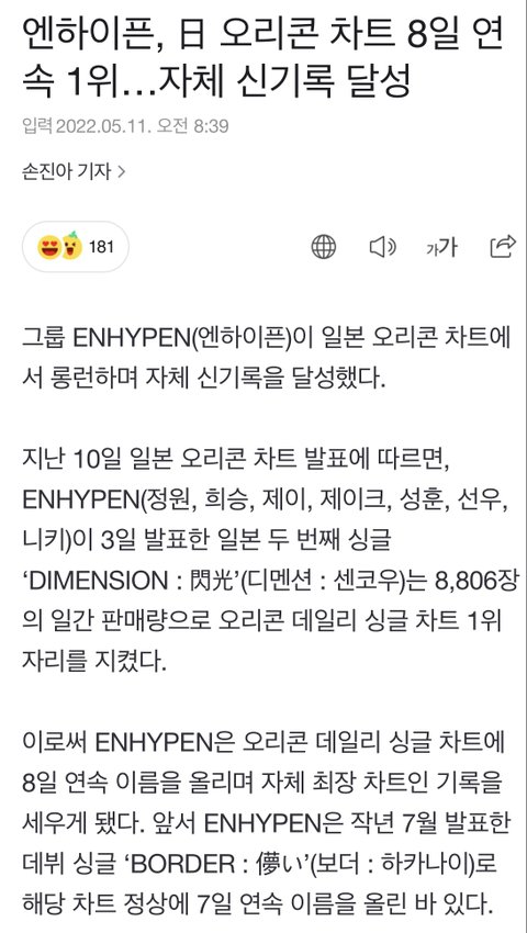 8일 연속 오리콘 차트 1위래