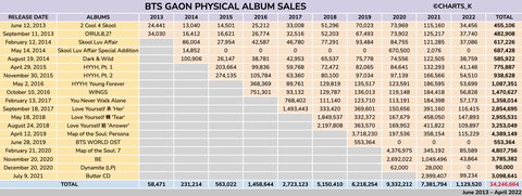 1월부터 4월까지 가온에서 집계된 예전 앨범들 판매량 합계