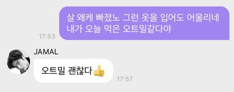 갑자기 오트밀 이러길래 난 이해못하고 '머가 괜찮다고..?'오트밀이 뭐야?' 이걸로 버블 답장 2개 썼었거든 ㅋㅋ 근데 재현이 아마 이 팬분이 쓴 답장보고 그런거같아 넘 귀어움