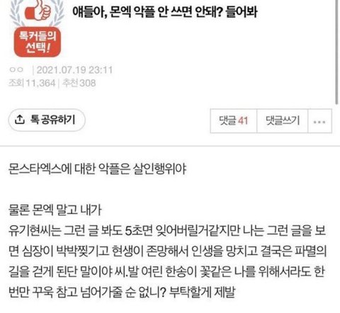 몬엑은 계약만료 돼도 5초면 잊어버릴거같지만 나는 그런 글을 보면 심장이 박박찢기고 현생이 존망해서 인생을 망치고 결국은 파멸의 길을 걷게 된단 말이야 씨.발 여린 한송이 꽃같은 나를 위해서라도 한번만 꾸욱 참고 넘어가줄 순 없니? 부탁할게 제발