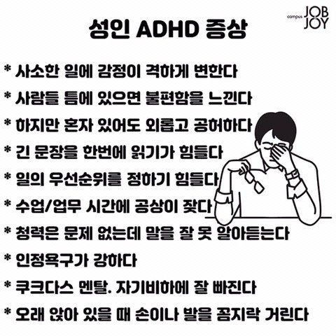 뭔가 요즘 나도 내가 이상한 것 같아서 이 글 보고 성인adhd검색해 봤는데 이거 너무 나랑 똑같은데.. 진료 받아보고 싶은데 엄마가 뭔 소리 하는거냐고 뭐라할 것 같아서 못보겠다ㅠㅠ 근데 너무 내 얘기야