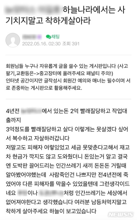 B씨는 같은 날 오전 2시30분쯤 오토바이 관련 인터넷 커뮤니티에 올린 글에서 “4년 전 (A씨가 운영 중인) 매장 돈 2억원, 작업대출로 3억원씩 사기를 당했다”며 “이렇게는 못 살겠다 싶어 복수하고 극단적 선택을 하러 간다”고 말했다.
