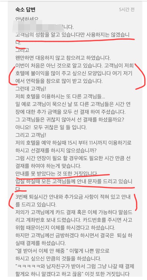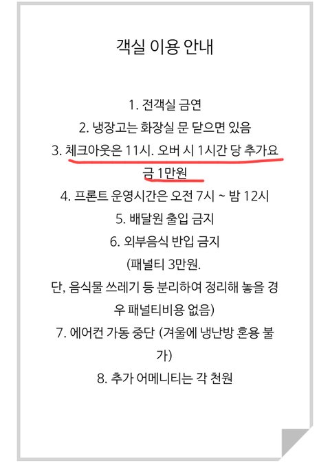 그러고 11시 02분에 전화 와서 퇴실시간인데 퇴실을 안 해서 전화드렸다고 전화 오셨구요 제가 연장 할려고 전화 드렸더니 안 받으셨다고 말 하니까 죄송하다는 말 한 마디 없이 연장할 거면 계좌이체해달라고 하더라고요.
