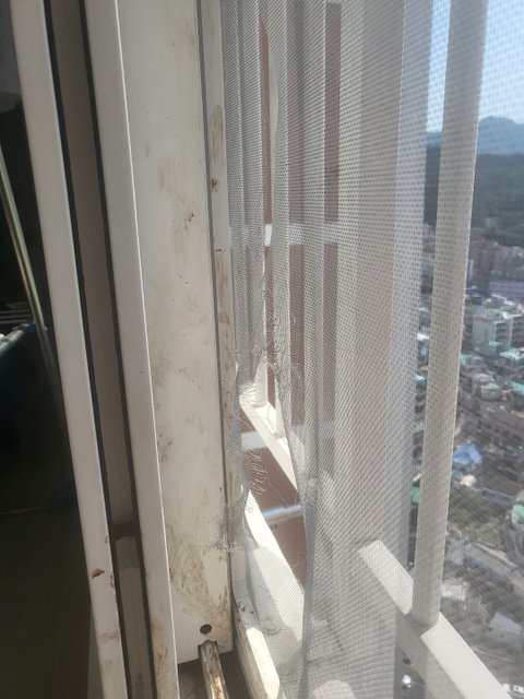 안쪽에도 핏자국이 있습니다.. 저 사이를 비집고 들어가서 긁다가 뒤로 못빠져나와서 방충망을 긁다가 방충망이 터져서 그대로 추락했습니다..
