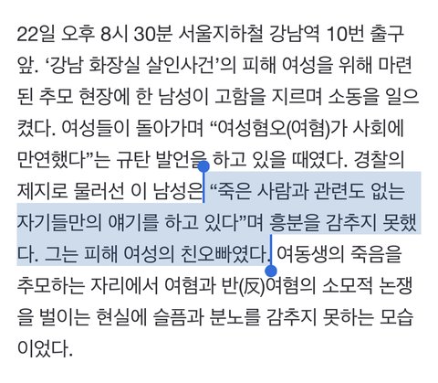 여성들은 여전히 일상에서 불안을 느끼고 위협을 받는다면서 피해자에 애도와 연대 목소리를 냈다. 온라인 추모 메시지를 적은 한 시민은 “6년이 지난 만큼 세상이 어떤 부분에선 나아졌지만, 여전히 여성의 현실은 그대로”라며 “여성 혐오 범죄가 없는 나라가 될 때까지 싸우겠다”고 했다. 다른 시민은 “여전히 여성은 안전하지 않은 세상에 살고 있고, 너무 흔해서 보도조차 되지 않는 죽음이 많다”며 “모두가 위협 없이 살 수 있는 세상을 꿈꾼다”고 적었다.