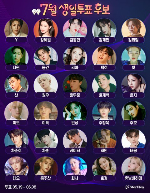 내일부터 스타플레이에서 생일투표 열리는데7월 생일 투표 후보에 인성이랑 주호랑 다원이까지 있대