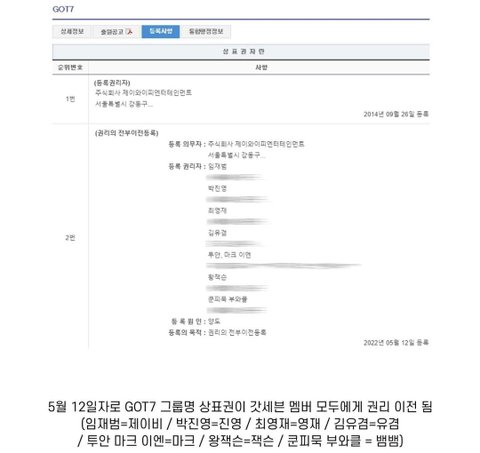 아니 GOT7특허권을 JYP가 가지고 있는데 맘대로 쓸수가 있겠나 지금도 특허청 키프리스 검색하면 JYP거라고 나오는데 법적권한이 없는데.될리가 없음 가지고 싶으면 소송해서 뺏어와야하는데 힘들고 JYP가 평소 호불호는 있겠지만 그런거 가지고 소송하고 그런 스타일은 아님 그냥 쓰게 냅둔거지