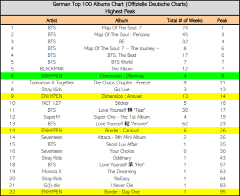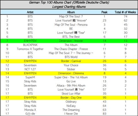 독일 앨범 차트 100위권에 한국 앨범 전곡 들어가 있는건 케이팝 그룹 중 엔하이픈이 최초래