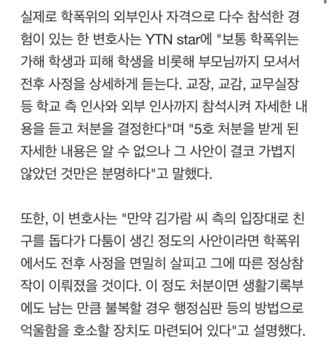 학교에서도 전후과정 살피고 김가람의 내용이 사실이라면 정상참작이 이뤄졌을 것이라 주장함, 그리고 5호처분이 억울하다면 억울함 호소할 장치도 있다고함