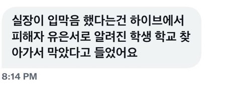 대한민국 학교폭력을 앞장서서 장려하고 가해자를 보호하고 사랑하고 함께하는 하이브는 이번엔 제대로 짚고 넘어가야 할 것이다. 글 몇마디로 사과할 시간은 이미 지났다. 방시혁은 책임지고, 피해학생 앞에서 무릎꿇고 사과해라. 네가 더 나쁜놈이니까. 나이만 어른이고 애들 상대로 할짓 못할 짓 구분도 못하는 이성잃고 돈만 보는 악마.
