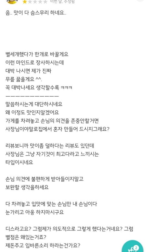 저런 사장 때문에 별점 안 믿음. 보통은 3개지. 배달앱은 보통이 5개인 줄 알아. 좋음아주좋음은 아예 없는 줄 알더라. 그럴 자격이 없다고 생각하나? 저런 정신머리로 무슨 장사를 해.