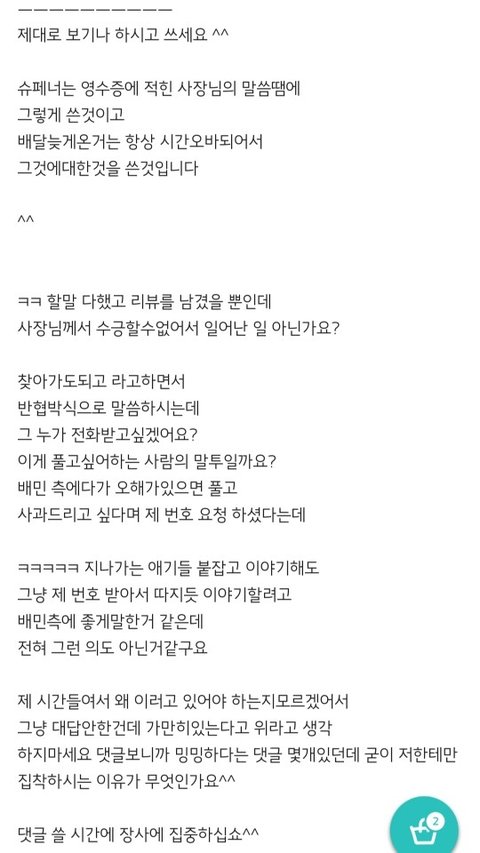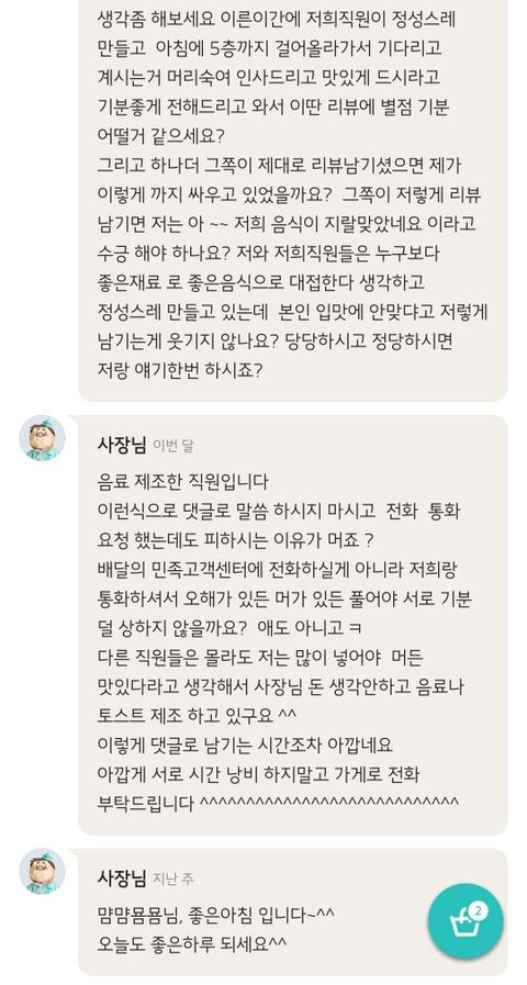 두 또라이의 대격돌...사장이 절대 손해인데...저거보고 무서워서 어떤사람이 배달시키냐..리뷰안달거나 별 다섯개 아니면 저 ㅈㄹ할거아님