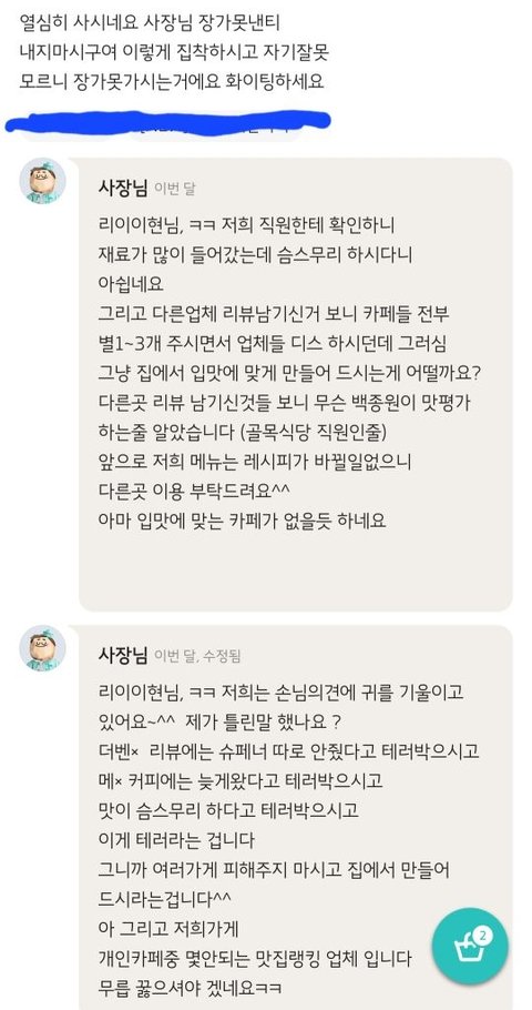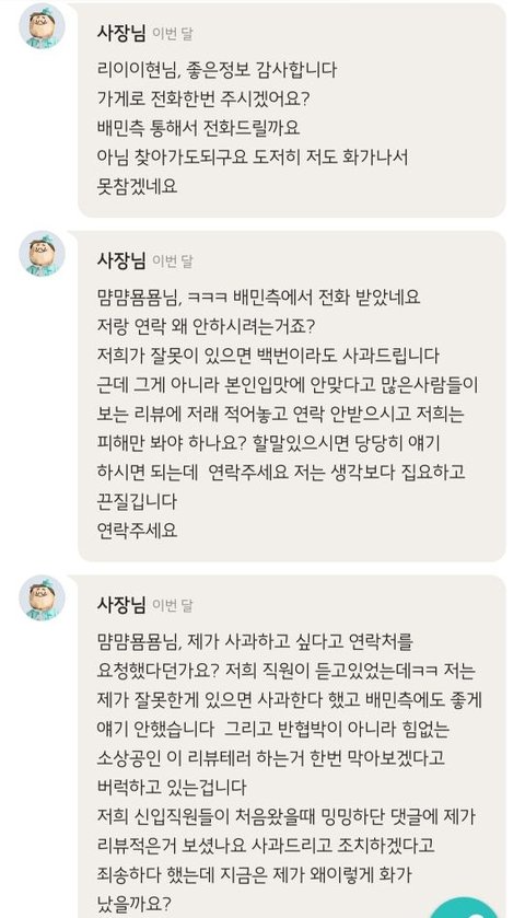 대충 어떤 상황이고 사장님 맘 알겠다만 계속 일부러 답댓 다는 거 무서워서 시켜 먹을라다 말았음 ...