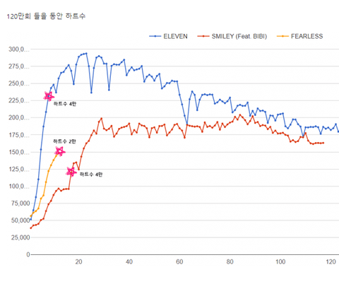 스밍 누적 120만회가 될 때까지 하트수가 이러함