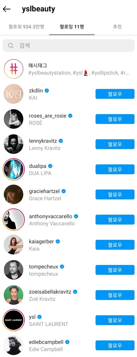 지금 현재 입생로랑뷰티 계정이 블핑 로제, 엑소 카이 이렇게 두명만 팔로우하고 있는데 옴걸팬들 왜 자꾸 생로랑 여자 뮤즈가 유아라고 우기고 다니는거야?