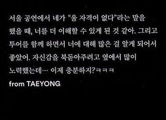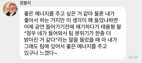 물론 타멤버들도 엄청 챙겨줬겠지만 태용이는 진짜 따수움 ㅠ 이거랑 콘서트 첫날 때 정우 합류 부담 어쩌구하면서 잘하라고? 말해준 것도 그렇고 동생들 너무 잘 챙겨주는 듯 개인적으로 동생들한테 존댓말 쓰는 모먼트가 날 미치게 해 ㅠㅠ 딸기즈 조합 너무 좋다
