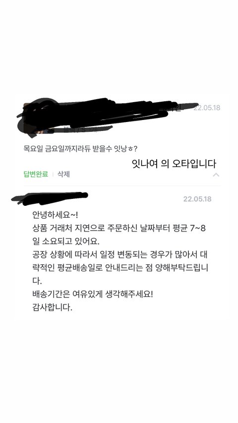 쇼핑몰에서 5.17일 스커트 구매한 이후, 익일 18일날 이번주 내 수령이 가능한지 문의글 남겼습니다.
