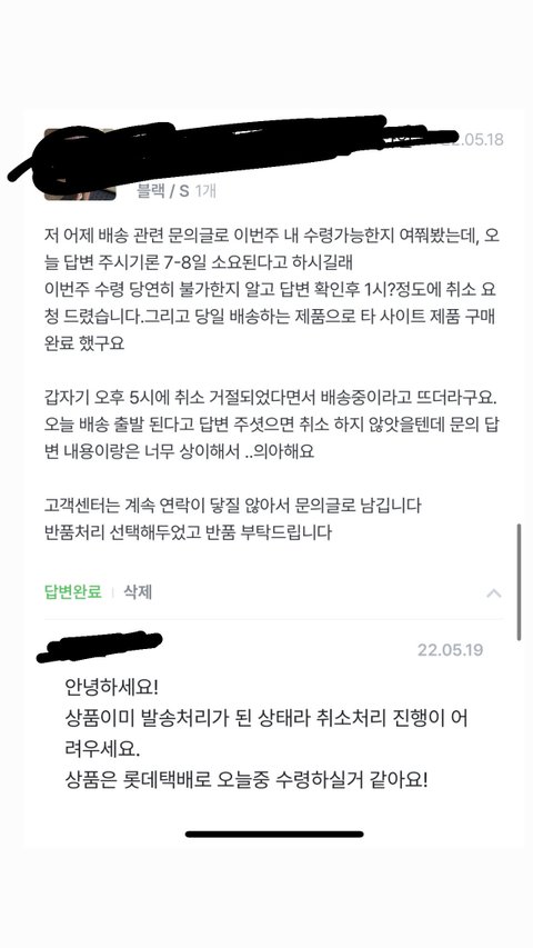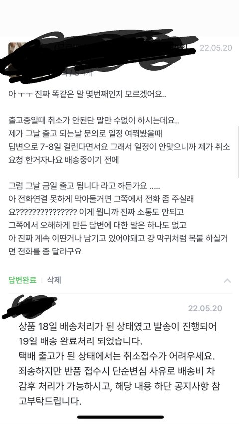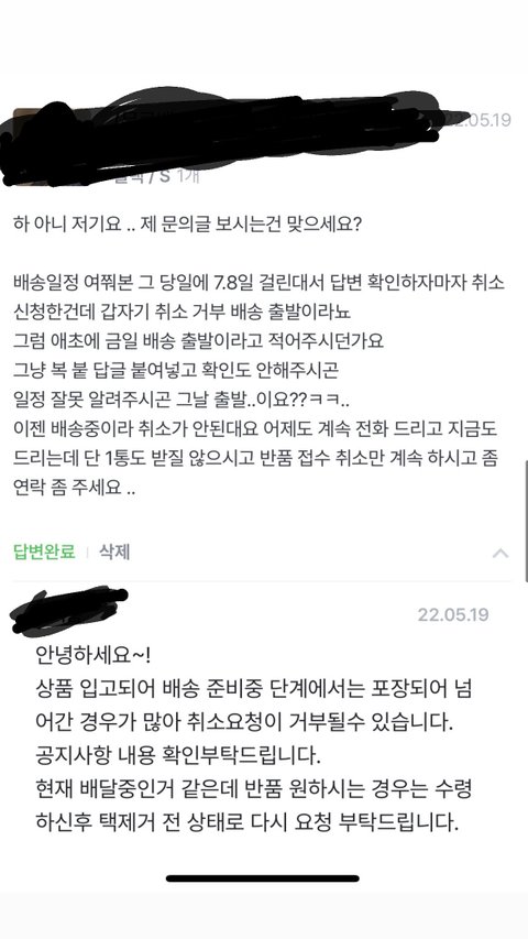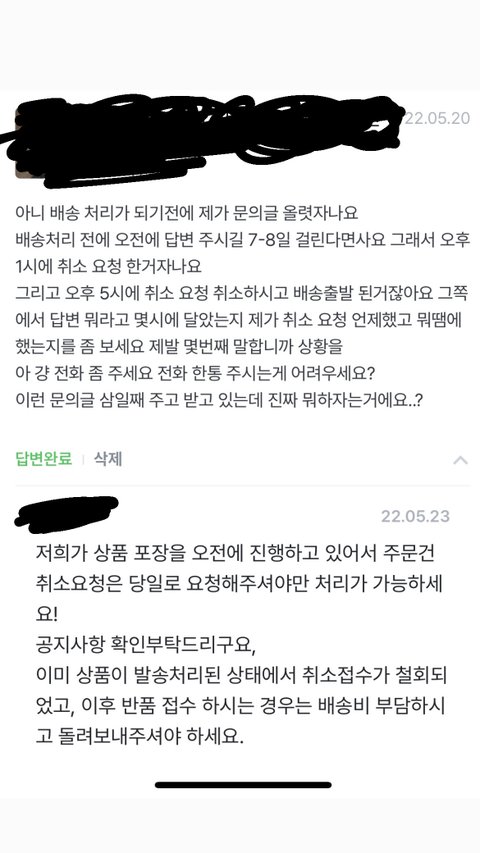 당일 출발할 제품의 배송 일정을 묻는 문의글을 확인조차 하지 않고 형식적인 답변으로 대응한 이후, 그 답변글을 확인하고 취소한건데 당일 출발 완료 됐으니 단순변심으로 반품 접수 진행하라고 하더라고요(욍복 택배비 소비자 책임)