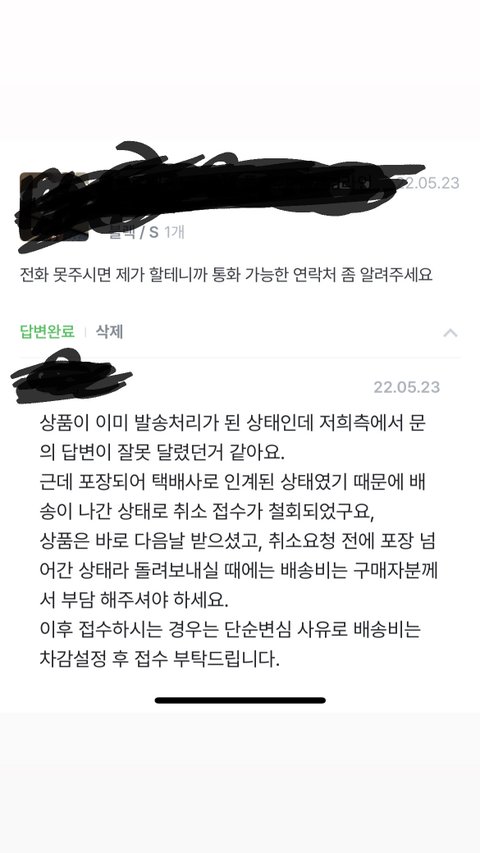 더 화나서 취소 문의 택배비 문의로 처음 문의 남긴건 맞는데 업체 대응에 화가나고 일주일치무시에 화나서 전화 할라 한거라 함