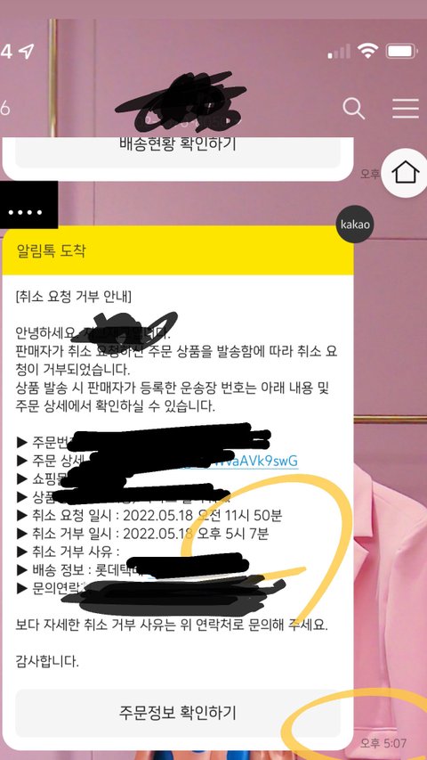 오후 5시경 주문 취소 요청이 거부되었다는 알림과 배송이 출발 되었다는 알림을 받았습니다.