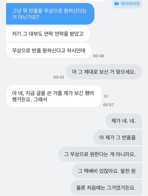 재연결 하자마자 이름 묻고 그냥 뭐 반품을 무상으로 원하신다거 아닌가요?하면서그럼 그렇게 처리해 드리는 걸로 하고 라함 (처음에 상황설명 없음+ 사과 안함)