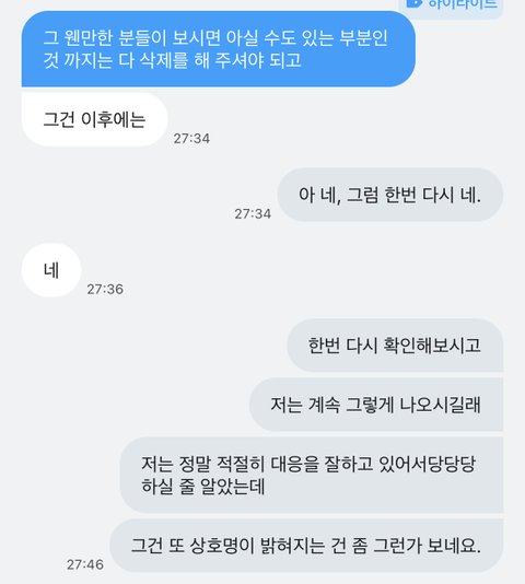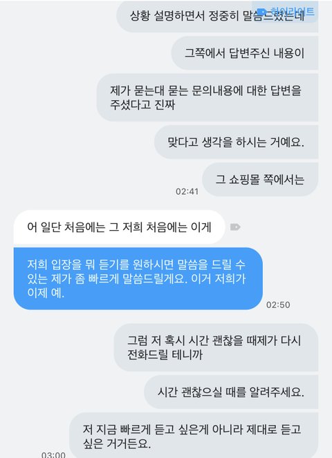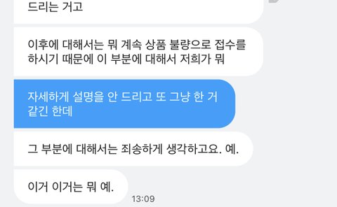 내 말투가 격양되어있었음 받자마자 저런말이나 하는데 일주일분노+ 더 화남 진정 어려웠음 그렇다고 소리지르거나 이런건 없었음 진정해라~~이러고있음 이때 나한테 사과는 했음 하지만 이미 초반부터 저런식으로 나와서 진정성 1도 안느껴짐