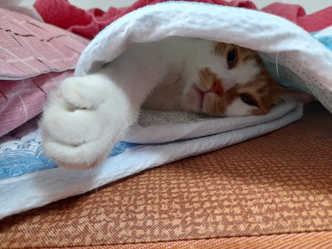 외출 후 집에 들어오니 발가락만 내놓고 이불속에 들어가 자고 있음.