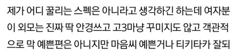 제가 어디 꿀리는 스펙은 아니라고 생각하긴 하는데 여자분이 외모는 진짜 딱 안경쓰고 고3마냥 꾸미지도 않고 객관적으로 막 예쁜편은 아니지만 마음씨 예쁜거나 티키타카 잘되는거나 센스있는게 너무 마음에 들어서 솔직히 제 첫사랑이거든요. 제가 3년반동안 짝사랑 한 사람이에요.
