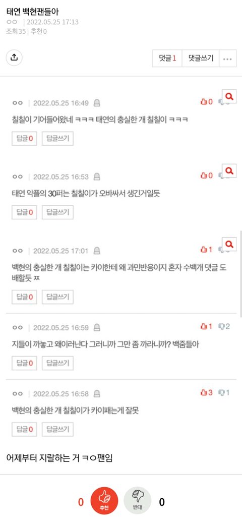 카이팬이 '~의 충실한개 칠칠이' 라는 단어를 쓰며 백현 태연을 깐다길래 봤더니 10분만에 지가 팬코하며 댓글 써놓고 카이팬이래ㅋㅋ 미치겠다 이 백현팬ㅋㅋ