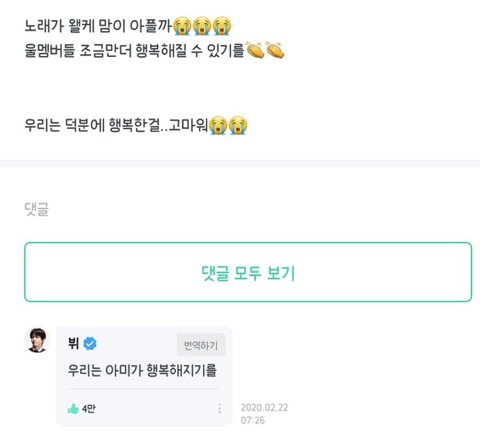 좀 더 보태서 말하면 어제 인스타랑 위버스 온거 관련해서 사실이 뭐든 뷔나 제니모두 회사가 침묵하고 있는입장에서 자기 의견도 말 못하고 그런상태일텐데 뷔는그냥 항상 하듯이 팬들 보려고 위버스에 들어온거임 그레고 보고싶다는 글에 답한거고