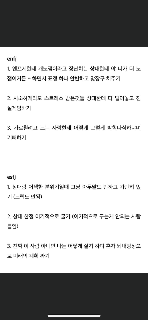 mbti 찐사랑 특징 보다가 esfj는 찐사랑 일 때 저거라길래 이해가 안돼서.. 왜 말은 없어지고 이기적으로 군다는건지 이해가 안되는데 . . esfj인 친구들아 설명 좀 해쥬