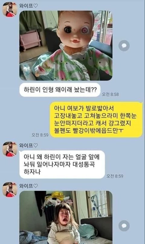 인형 고쳐놓으랬더니 펜으로 그려놓음