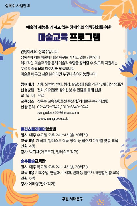 “상록수 무료 미술교육 수강생 모집”
