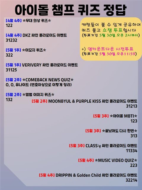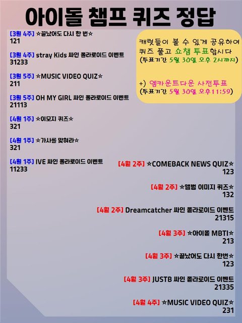 쇼.챔 챔심 모으는 퀴즈 정답들이야!!